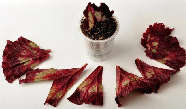 При втория метод трябва да отрежете лист от растение с 7 см резници и да го отрежете през вените. След това поставете листа с лицето надолу върху мокра почва, притиснете с камъни близо до разфасовките. Покрийте с найлоново фолио отгоре и поставете на слънце. В бъдеще пръскайте почвата с пулверизатор.
