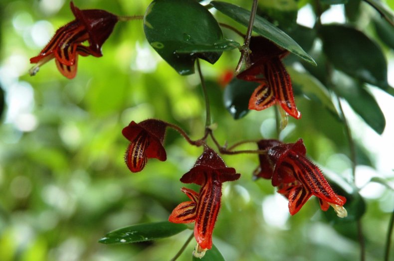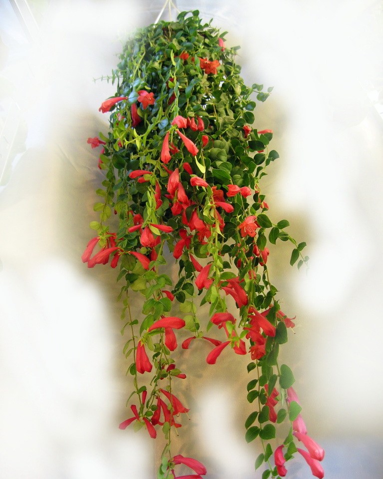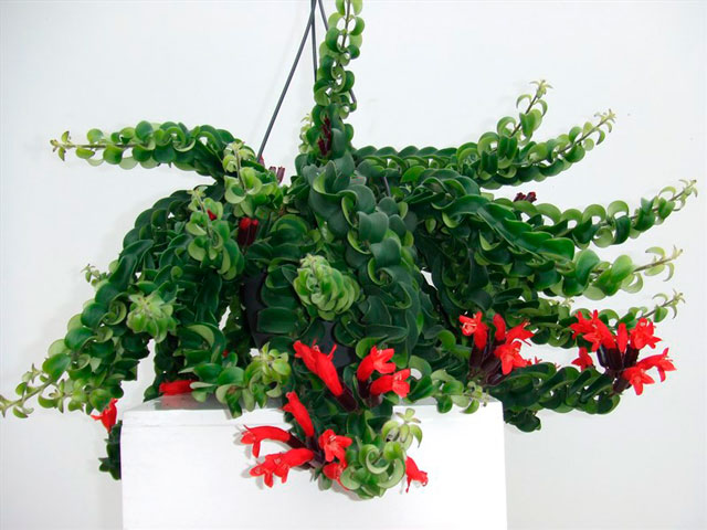 Необичайна цветова комбинация в гроздове съцветия от Aeschinanthus Robin. Тубулите, от които се появяват венчелистчетата, са оцветени в кестеняво, а самите цветя са яркочервени. Издънките са дълги с тъмнозелена зеленина.