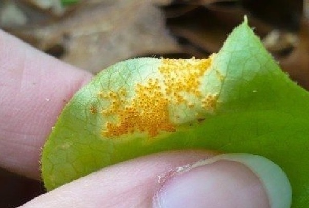 - Първо ръждата се появява от долната страна на листа като оранжево-кафяви спорови петна. След това отива към горната повърхност. Листата на фуксия започват да кафяви или пожълтяват, падат.
