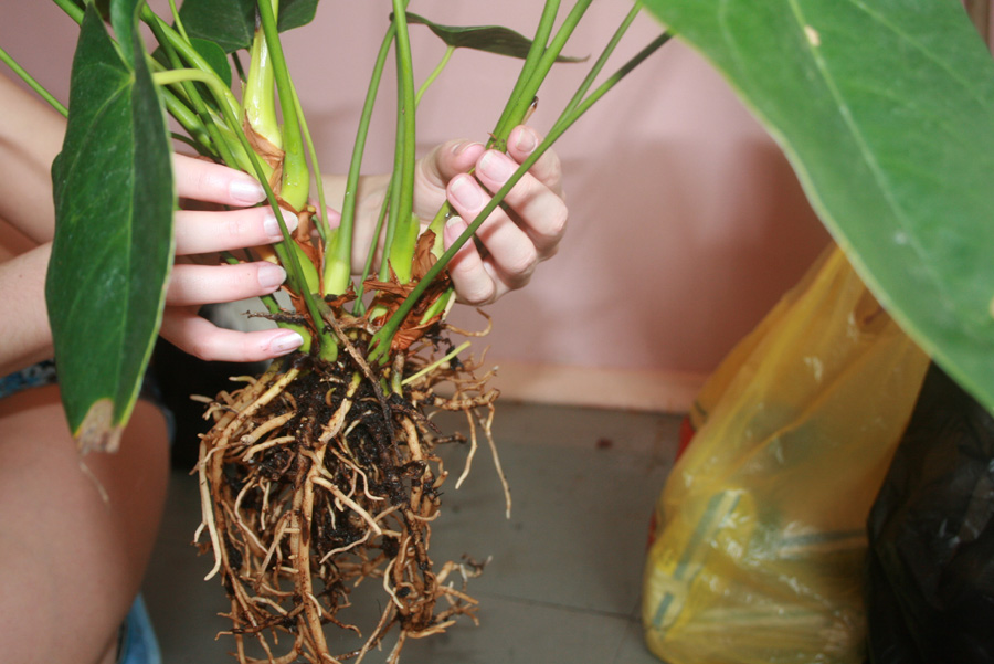 Честотата на разсаждане зависи от възрастта на растението. За млад храст процедурата трябва да се извършва всяка година. По-старият антуриум се трансплантира веднъж на 3-4 години. Препоръчително е да направите това през пролетта в следната последователност: