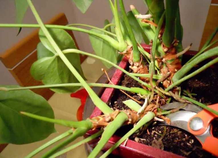 - При възрастно и задължително здраво растение се отрязва силен издънка с междувъзлия и поне два листа. Листата се отчупват, но дръжките остават.