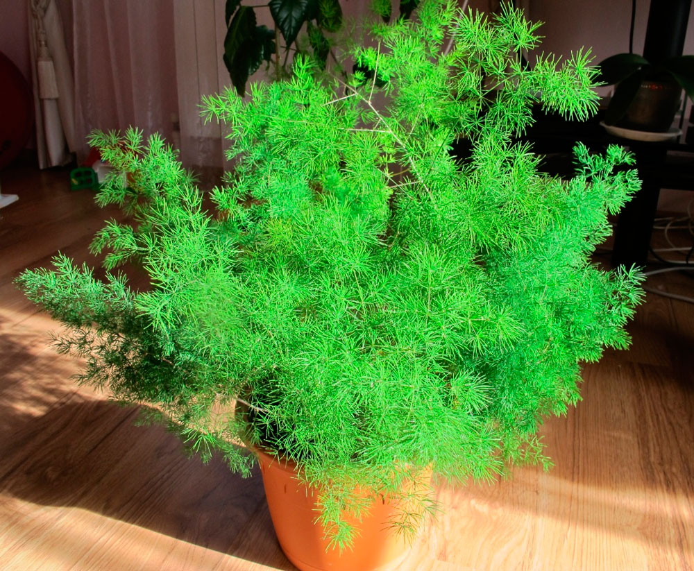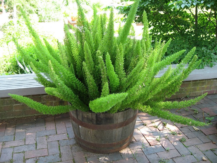 Средно големи саксии са подходящи за аспержи, тъй като водата може да застоява в големи контейнери, в резултат на което почвата вкисва и кореновата система умира. Цветето предпочита свеж, влажен въздух, често поливане, редовно хранене.