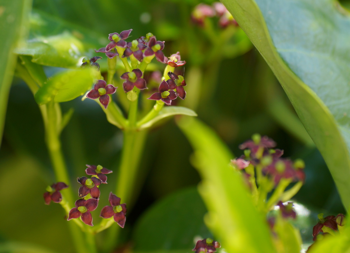Цветето Aucuba е тъпо червено-кафяво съцветие, което се събира в метли. Преди цъфтежа полът на растението е трудно и почти невъзможно да се определи. Плодът е малки плодове, които стават или оранжеви, или червени (рядко бели и зеленикави).