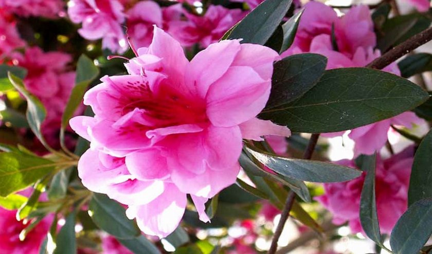 Индийската азалия е вечнозелен храст с малки черешови листни остриета и цъфти през зимата.