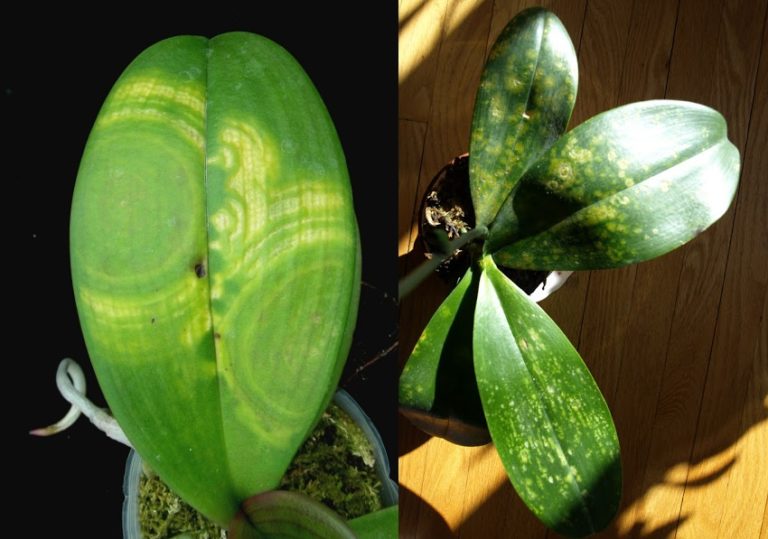 Упоритите петна по листата на орхидеите показват хлороза. Диагнозата хлороза се поставя върху цвете при условие, че след появата на петна, листата започват да се свиват, да се извиват.
