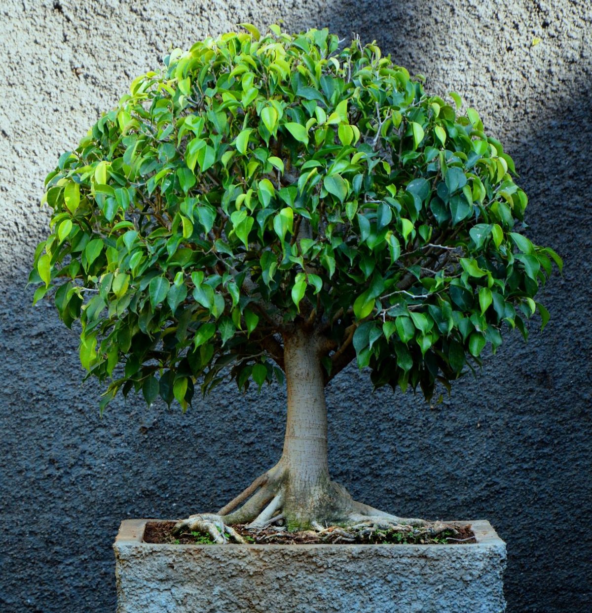 Изборът на фикус е напълно оправдан, тъй като той се отличава с разклонени корени, масивен ствол с извивка или богато украсен, красива гладка или текстурирана кора и бърз растеж и следователно е подходящ за отглеждане в миниатюра и е лесен за оформяне. Ficus не е придирчив към слънчевата светлина, сутрешната слънчева светлина е по-подходяща за него, докато дневната може да причини изгаряния на листата.