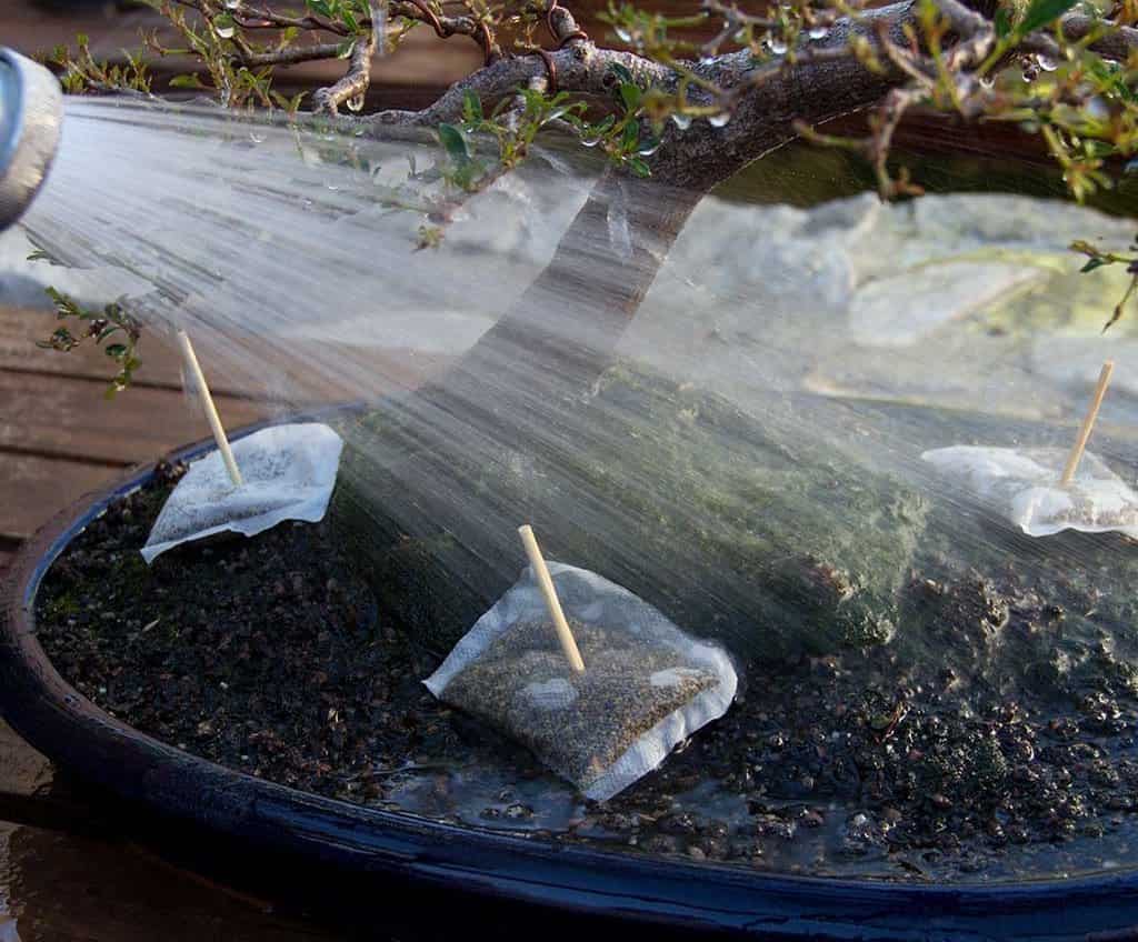 Поливайте цветето бонсай изключително с разтопена вода. Ако няма такъв, вместо него се използва добре утаена вода. Температурата по време на поливане трябва да е стайна.