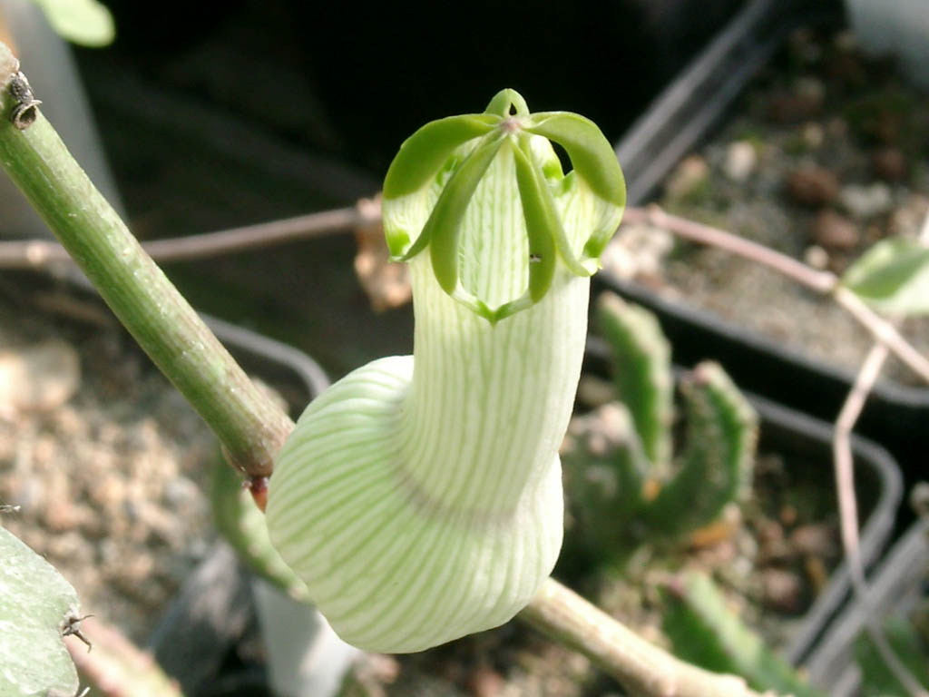 Стъблата на този вид обикновено са дълги и тънки, леко се разпространяват по повърхността, а листата са меки, месести, широки около 40 мм и дълги 50 мм. Те приличат на сърце по форма. От шевната страна на листовата плоча може да се наблюдава изпъкнала централна жилка. Има и къси нискоцветни съцветия. Зеленият венец, който придобива по-светъл цвят в областта на фаринкса, достига дължина от 70 мм.