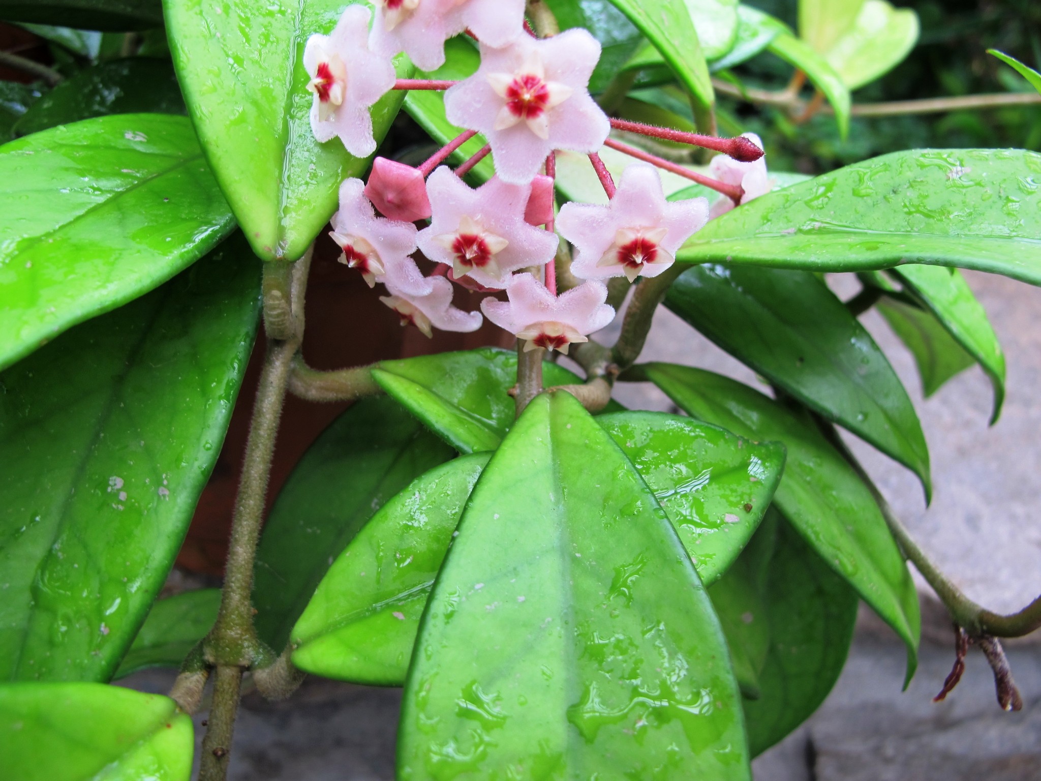 Вкъщи месестият хоя поведе. Дължината на издънките му е 6-7 м. Листата са тъмнозелени, растат един срещу друг. Структурата е кожена. Този бръшлян се нарича още восъчен бръшлян. Съцветията приличат на чадър. Формата на пъпката е като звезда. Всяко съцветие може да има до 50 пъпки от кафяви, светло зелени или бели цветя.