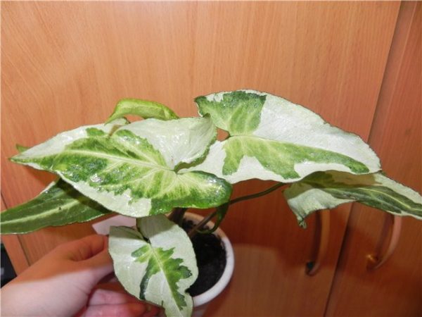 Сингониум лиана има тънко стъбло. Листа с остър край във формата на стрела. При по-старите растения листните плочи се дисектират до основата. Те растат на дълги стъбла. С течение на времето цветът на листата се променя от яркозелен до сребрист с тъмни жилки.Отглежда се като висящо растение от висяща ваза.