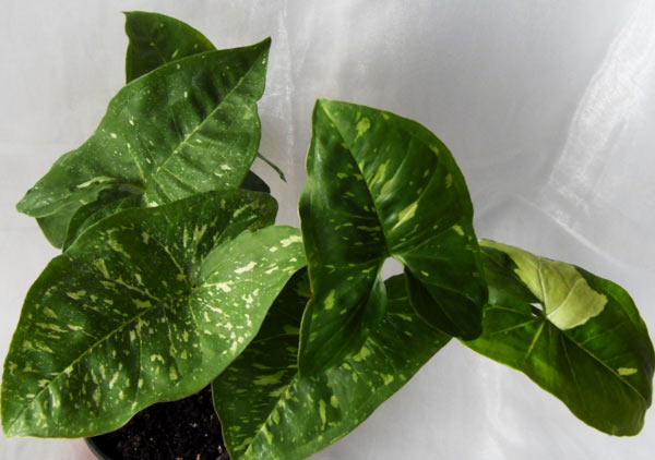 - Syngonium Red Spot: листата са тъмнозелени на цвят с розови петна, които са подредени по хаотичен начин. Листата растат до 15 см дължина. Формата им може да бъде много разнообразна: под формата на стрели, сърца или копия. Растението е малко;