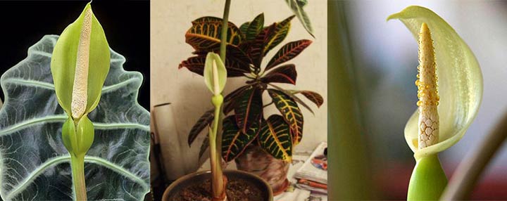 - Alocasia Amazonica (Alocasia amazonica) с розово-зелени дръжки с дължина половин метър, щитовидни листа с ширина до 20 см и дължина до 50 см могат да цъфтят в много редки случаи. Alocasia Amazonica на нисък дръжка образува цвете с дължина около 10 см, покрито със зеленикав воал.