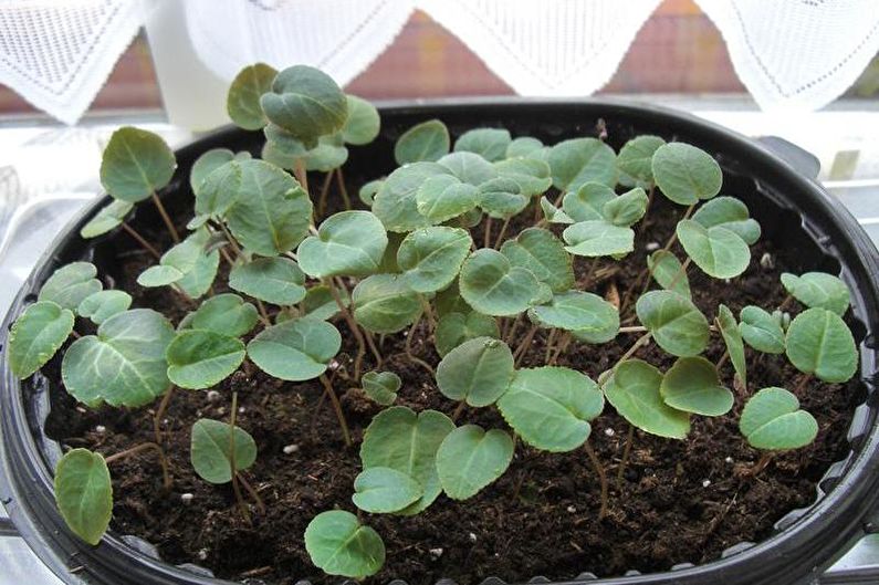 Почвата се нуждае от поливане и вентилация. Първо, на повърхността се образува лилаво-розов възел. Когато растат чифт листа, разсадът се гмурка и презаселва в отделни ястия. След 7-14 дни е препоръчително да се подхранва със сложен тор. Цъфтежът на циклама се очаква една година. Цветята, отглеждани у дома, се отличават със своята издръжливост и здраве в сравнение с закупените индивиди.