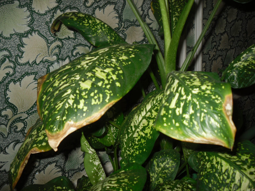 Когато въздухът в стаята е много сух, листата на дифенбахия започва да пожълтява и изсъхва.За да се предотврати такава ситуация, е необходимо да се извършва често пръскане на листата.