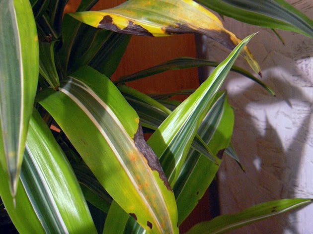 - Върховете на листата изсъхват или пребледняват. Това е следствие от висока влажност и висока температура в помещението, както и от липса на осветление.
