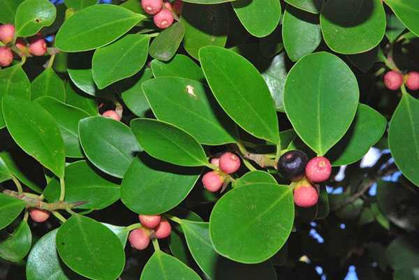 - Листата са с овална форма, извити в края, разположени на къси дръжки. Цветът на листата е тъмно зелен, дължината на листните плочи е от 5 до 10 см, ширината е от 3 до 5 см.
