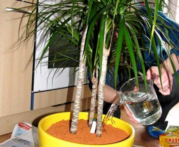 - През палета. Този метод на напояване се използва, ако има прекомерно изсъхване на почвата в саксията и отделянето й от стените. В този случай водата се излива директно в тигана и цветето поема необходимото количество, използвайки кореновата си система. Почвата в саксията се навлажнява, без да се натрупва излишна влага. Невъзможно е да се полива постоянно по този начин, тъй като това натрупва сол в почвата, което може да навреди на драконовото дърво.