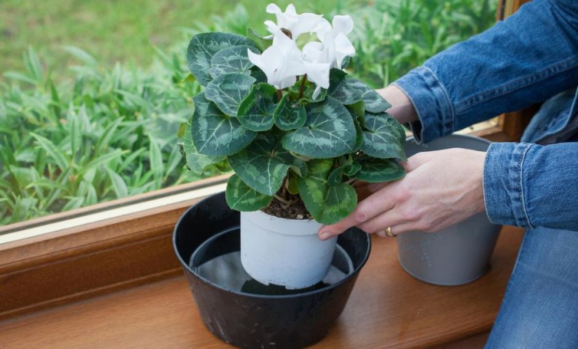 Когато отглеждате циклама, е по-добре да организирате поливане на цвете през палет. При този метод водата няма да попадне върху клубените и пъпките. 2-3 часа след поливане на храста е задължително да се отцеди излишната вода от тигана.