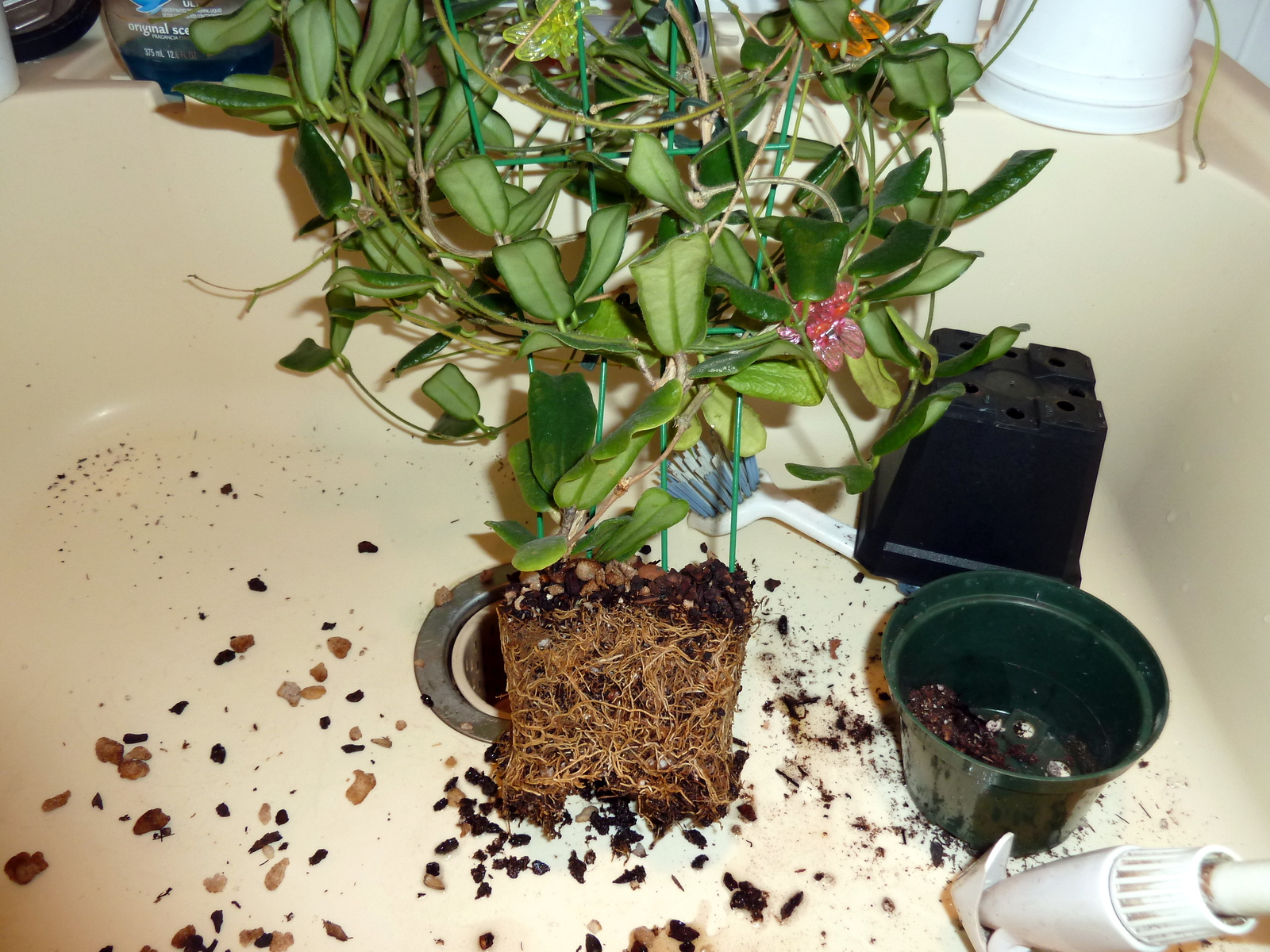 При пресаждането специалистите съветват да се използва методът за претоварване, така корените да са по-малко повредени. Преди разсаждането внимателно проучете колко плътно кореновата система е запълнила саксията. Ако тъкането на бели корени наднича от дренажните отвори, е необходима спешна трансплантация. Обикновено млада хоя се трансплантира веднъж годишно, като вдига саксия с няколко см по-голяма от предишната. Старите растения се трансплантират веднъж на 3-4 години според описанието.