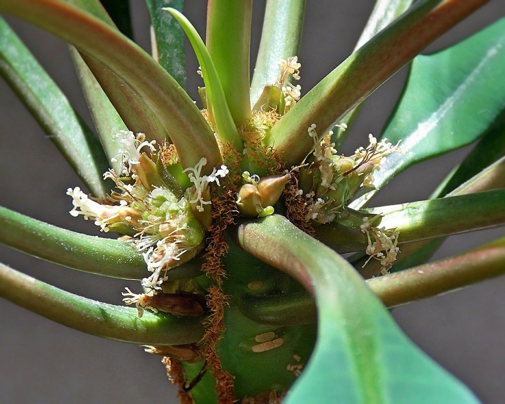 Euphorbia принадлежи към семейство Euphorbia. Има и други имена на това растение - маймунска палма и еуфорбия.