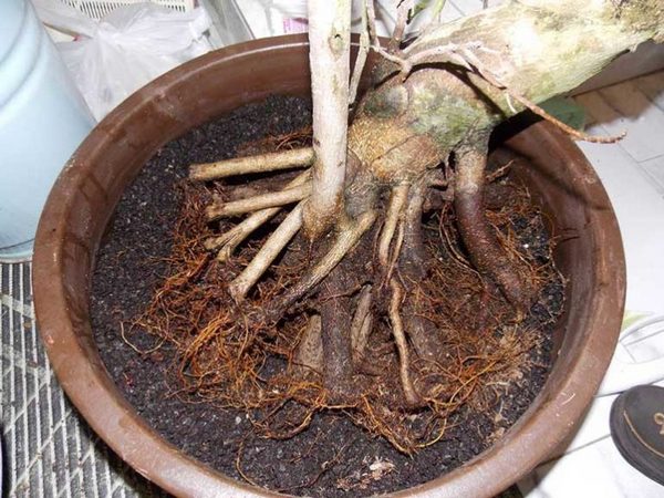 Патологичното състояние се формира под въздействието на постоянно влажна почва, активен растеж и размножаване на гъбична инфекция. Той улавя кореновата система, като в крайна сметка засяга цялото растение. Корените стават кафеникави на цвят, омекват и загниват. Дървото не получава необходимото хранене и започва да увяхва.