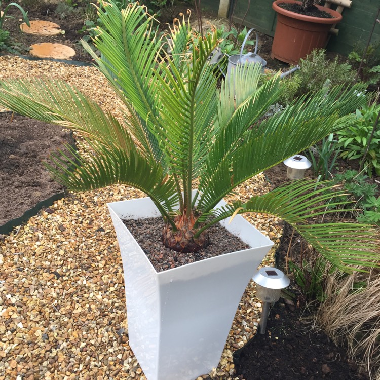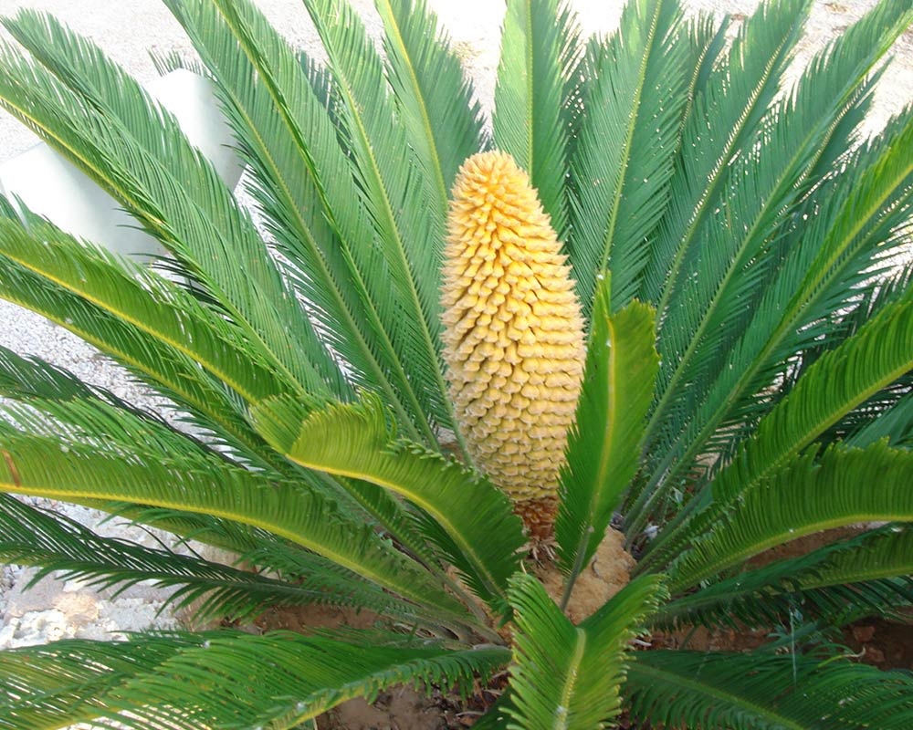 От основата на багажника, наречена каудекс, израстват пернати листа с дължина 80-100 сантиметра. В центъра на растението се образуват конусовидни цветя със златист цвят. Cycas revoluta може да расте 100 години.