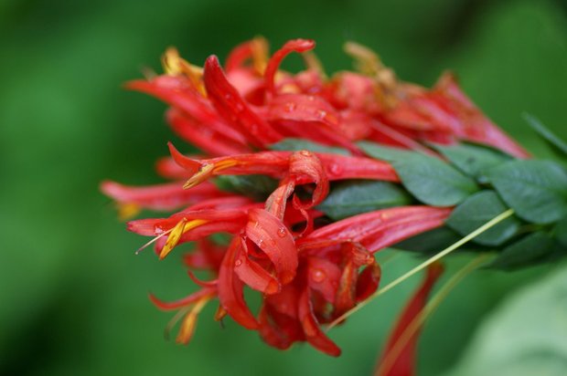 Джудже храст с тръбести цветя. Те имат червено-оранжев и розов оттенък.