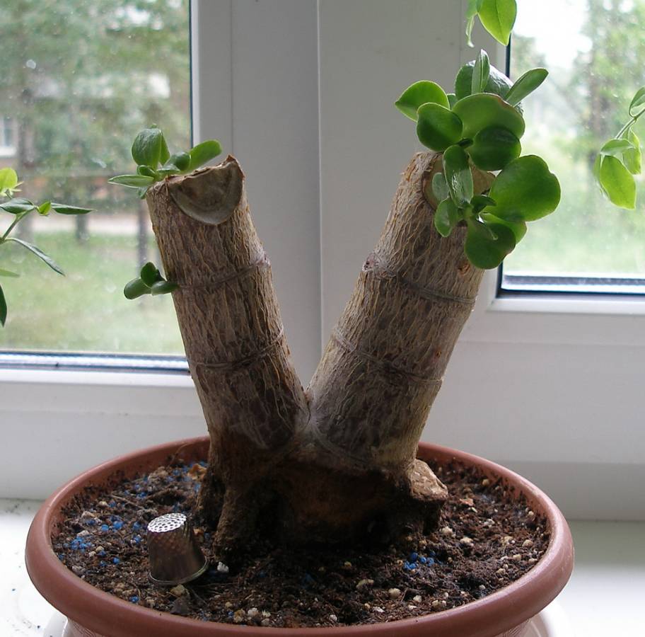 Млад индивид ще успее да направи стъблото широко; културата за възрастни не се поддава добре на подобни манипулации. Дебел ствол се получава чрез отглеждане на дълги клони. Дългите издънки имат силни основи. След като стъблото е настроено с достатъчна дебелина, дължината се отстранява. Листата в долната част на багажника също се отстраняват. Секциите се обработват с въглища и пепел. Разстоянието между почвата и отрязаните клони трябва да остане малко, можете да добавите земя. Сукулентното растение ще даде допълнителни корени и ще започне да се уплътнява в стъблото.