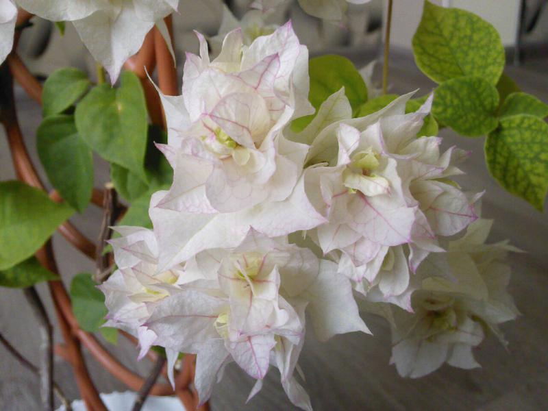 Прицветниците се считат за най-красивата част, които оформят малкия размер на белезникаво-жълти или сивкави цветове на бугенвилията. Именно прицветниците откривателите на растението приели за огромни цветя. Прицветниците са тънки, грациозни. Под тях се вижда шарка от тънки вени. Прицветниците имат различни форми: от триъгълна, кръгла до сърцевидна. Поради тази особеност растението е наречено „хартиено цвете“.