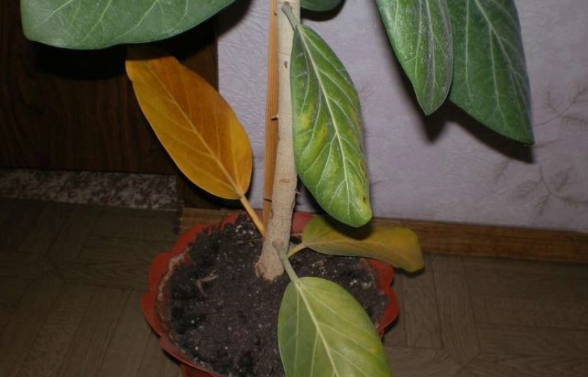Причината за изхвърлянето на листата е ниската влажност. В този случай те също пожълтяват. Листата трябва да се избърсват и пръскат по-често. До него се поставя съд с мокра експандирана глина.