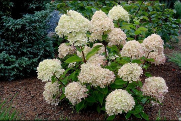 - Limelight - има доста силни издънки, благодарение на тях храстът придоби своята популярност в ландшафтния дизайн. Буйните съцветия се държат добре на тези стъбла и не „падат“ в страни. Съцветия - метлица. В зависимост от мястото на засаждане, той има различен цвят на пъпките в началото на цъфтежа. Ако храстът расте на сянка, цветята му ще имат зеленикав цвят (вар, откъдето идва и името), ако на слънце - бял. Постепенно пъпките ще променят тона си, докато станат напълно розови. Листата са леко космат, придават кадифено усещане. През лятото те са зелени, до есента се променя на ярко лилаво.