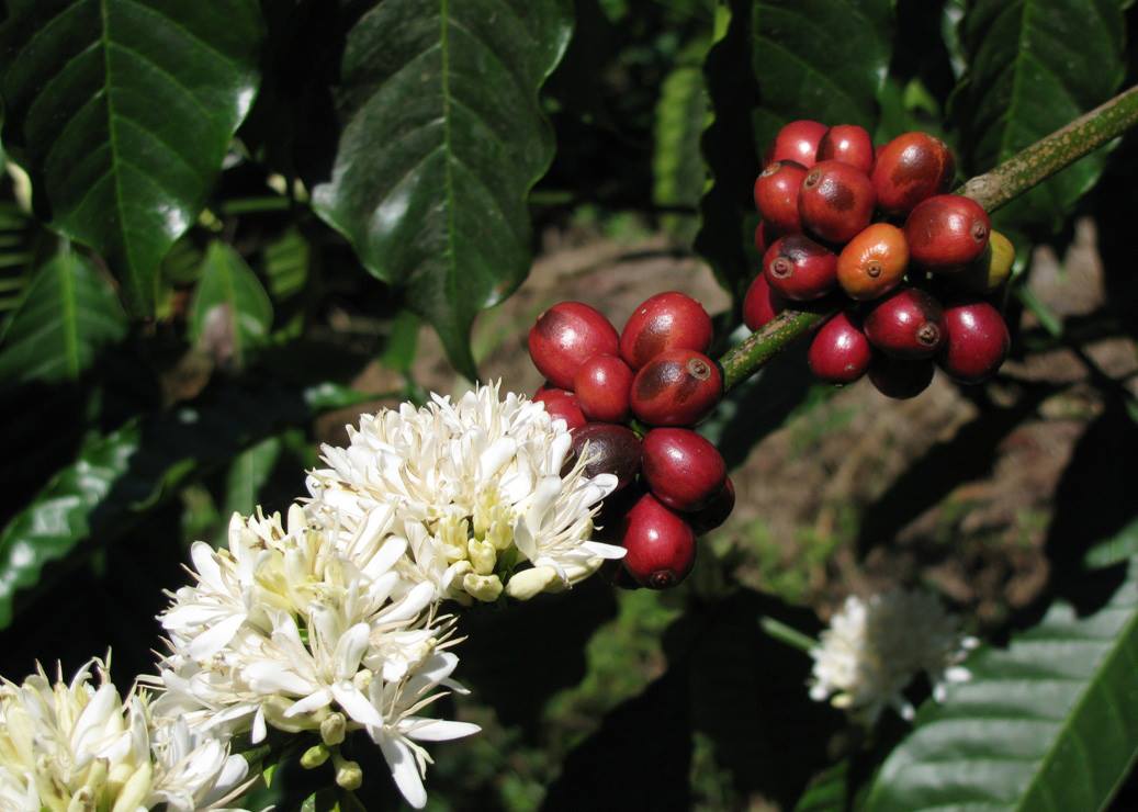След 6 месеца на мястото на съцветията се образуват плодове, които наподобяват удължени червеникави череши. Когато узреят, те потъмняват, придобивайки черен оттенък. В черешата има 2 кафе на зърна.