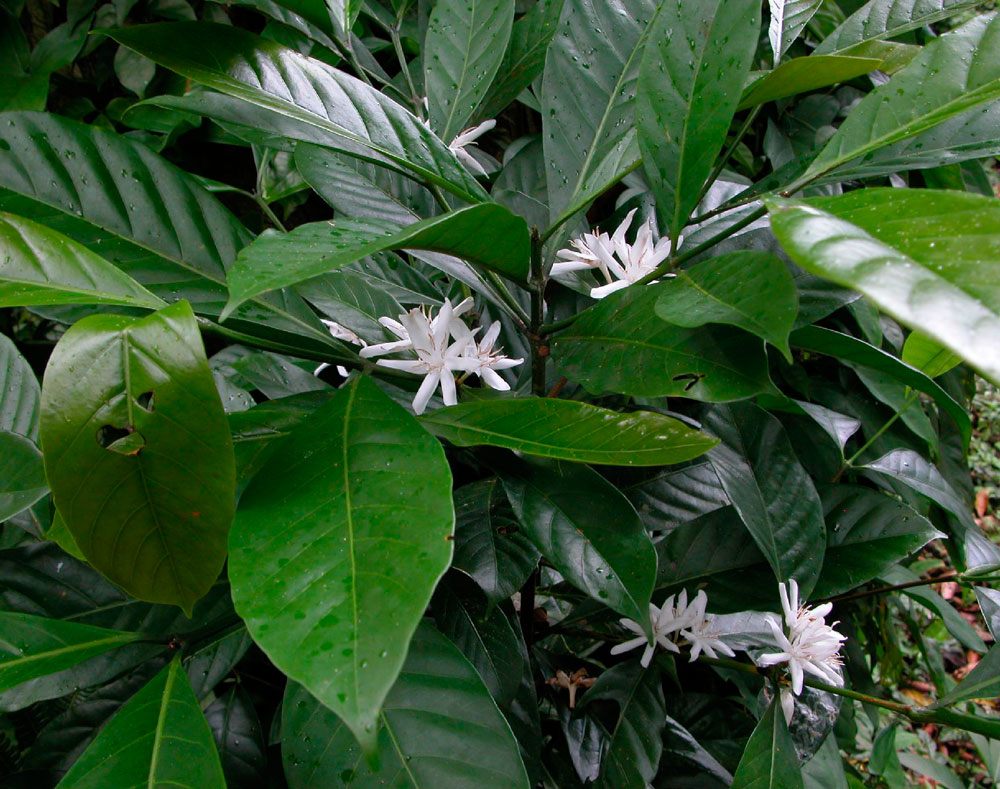 Кафеното дърво не е високо, прилича на храст с височина 2-3 м. Пубертетните листа са наситено зелени, с жилки. Ароматните цветя на кафе имат бял цвят.