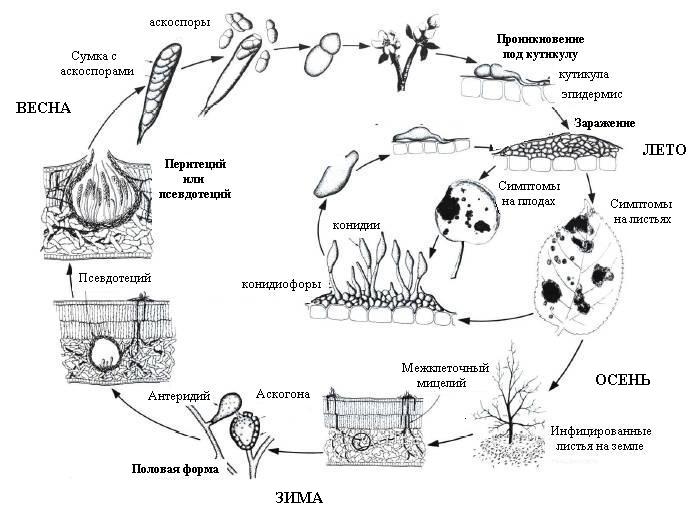 Гъбичната инфекция (на латински Venturia inaequalis) засяга младата зеленина, засяга плододаването. Болестта се разпространява бавно и неусетно, поради което не се забелязва веднага от собственика на ябълковата градина. Първичните признаци се регистрират в края на цъфтежа: върху листата се образуват жълтеникаво-зеленикави петна, на някои се вижда сивкав цвят. Постепенно те почерняват, улавят по-голямата част от листната плоча и мигрират към плодовете.