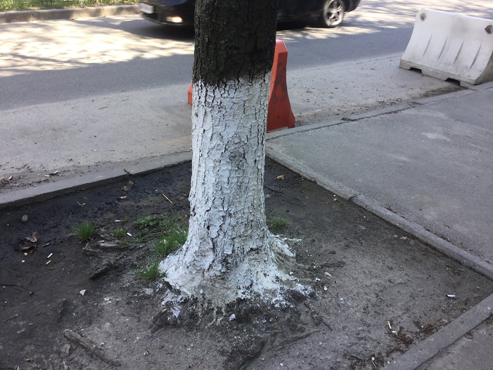 - Слънцезащита. Директните лъчи са опасни за кората, която се напуква под тяхно влияние. Следователно стволовете на дърветата се обработват с композиции от точно бяла, отразяваща светлината, цветова схема. Забележително е, че през зимата слънцето не е по-слабо по своя ефект, отколкото през лятото, така че е важно дърветата да се пазят целогодишно.