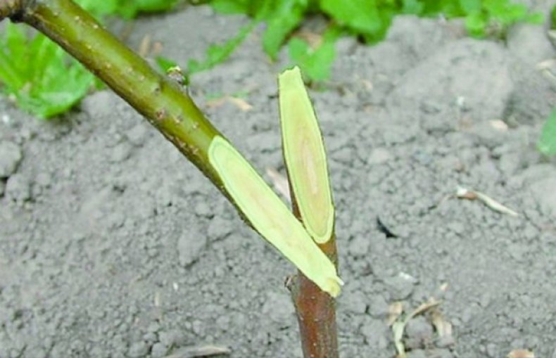 Най-простата ваксинация е за кората. Най-хубавото е, че се вкоренява по време на движението на сока, през месец април-май. Тогава кората лесно се отделя от дървото. Основното нещо е да направите правилния наклонен разрез в дръжката. Изработва се с остър нож, създавайки идеална повърхност за присъединяване на камбия на подложката и издънката. След това обвиването се извършва с филм.