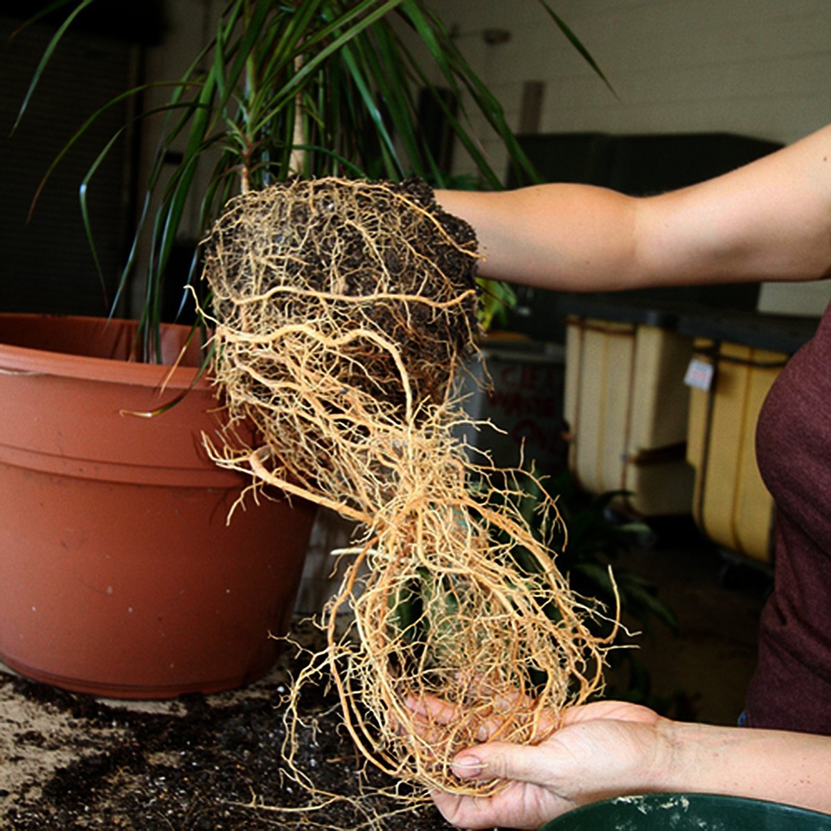 Подрязването на корен на драцена се извършва само ако е абсолютно необходимо. Причината за това може да бъде образуването на кореново гниене или силен растеж на корените. Здравето и външният вид на растението зависят от състоянието на кореновата система.