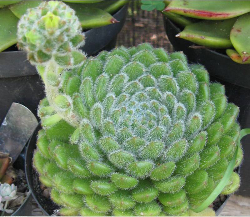 Храстови видове, което обикновено е необичайно за този вид. Сферични розетки, всяка от тях има до стотици ярки маслинови листа с дължина до 9 см и ширина до 3 см. Периодът на цъфтеж е лятен. Името си е получил от пухкавите листа, покрити с малки четина.