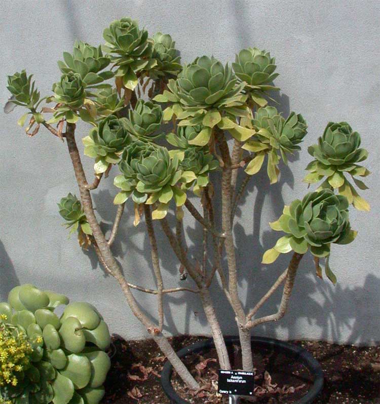 - грижата за еониевото дърво у дома изисква задълбочена. Той има леко разклонено стъбло, а листата са светлозелени, лопатовидни;