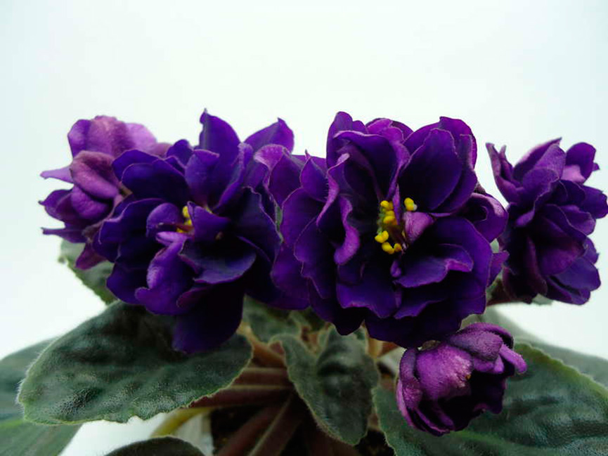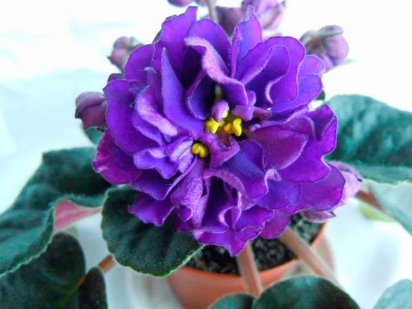С подходящи грижи виолетовата може да радва с цъфтежа си почти през цялата година. Цветът на цветята е тъмно лилав, много богат на цвят. На един цветонос, като правило, се образуват осем венчета. Пъпките имат заоблена форма, напомняща донякъде на сорта тъмна перла (Виолетова перла), цъфтят много бавно. По време на цъфтежа капачката на цветята не се разпада и въпреки големите си размери остава компактна. Такъв перлен цвят няма да остави никого безразличен.