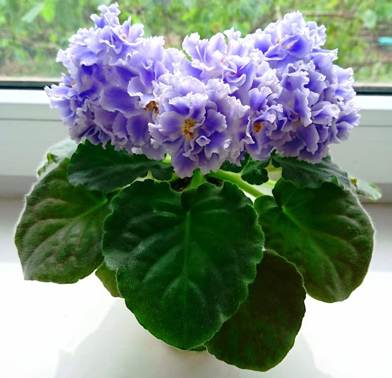 Листата на цветето са кадифени, овални. Сянката на външната част на листа може да бъде или светло зелена, или тъмна. На него ясно се виждат вени. Растението се отличава с големи съцветия от небесен нюанс. По ръба на цветето вълнообразната линия е на сянка по-лека от останалите.