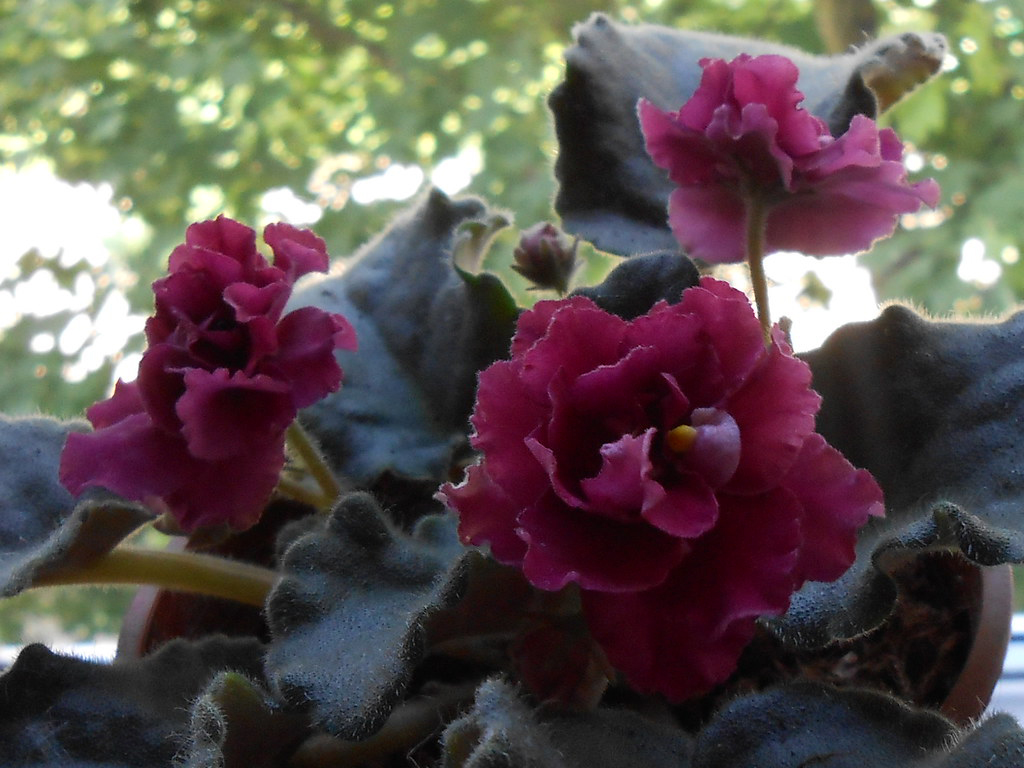На фона на тъмнозелена зеленина ярко се открояват двойни цветя с богат червен цвят, подобни на форма на миниатюрни рози. Виолетовата цъфти почти през цялата година.