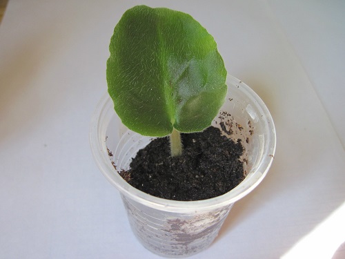 За да направите това, изсипете смес от перлит и торф в съотношение 60 до 40 в малка пластмасова чаша.Поставете листа на дълбочина един сантиметър и го фиксирайте в земята. След това е по-добре да поставите дръжката в оранжерия - тук процесите ще вървят по-бързо.