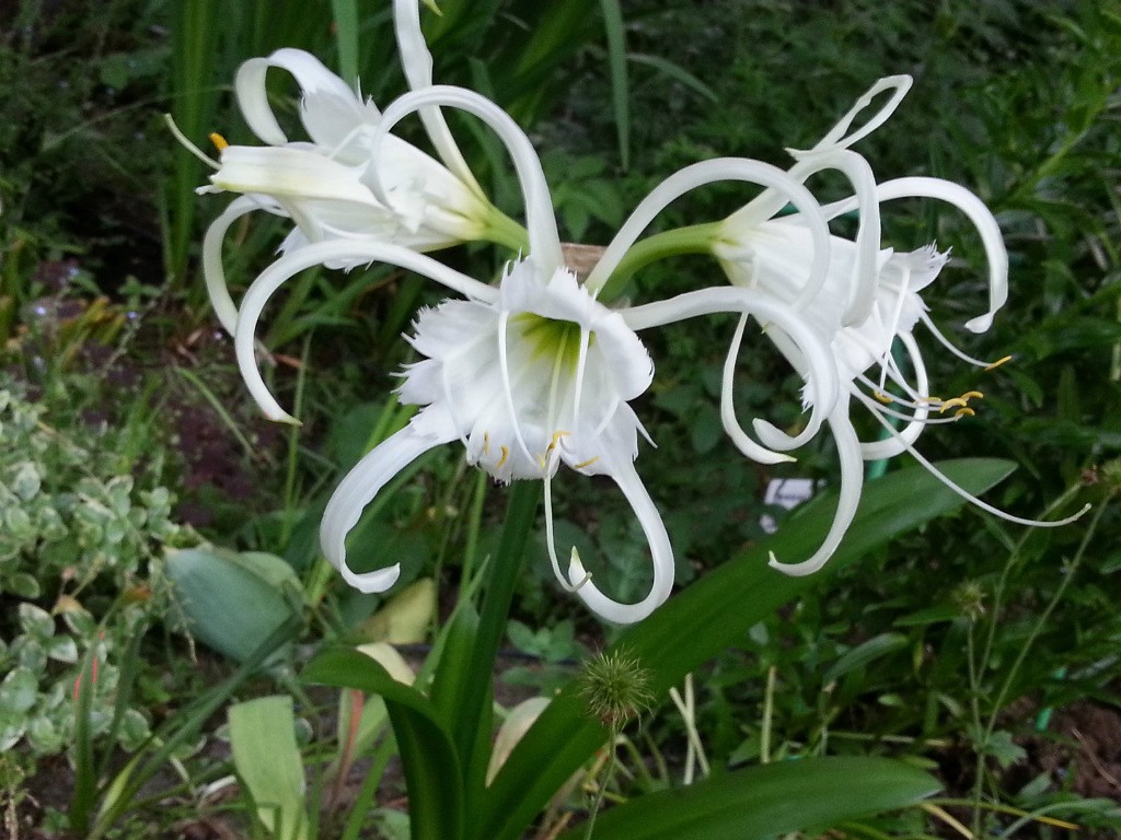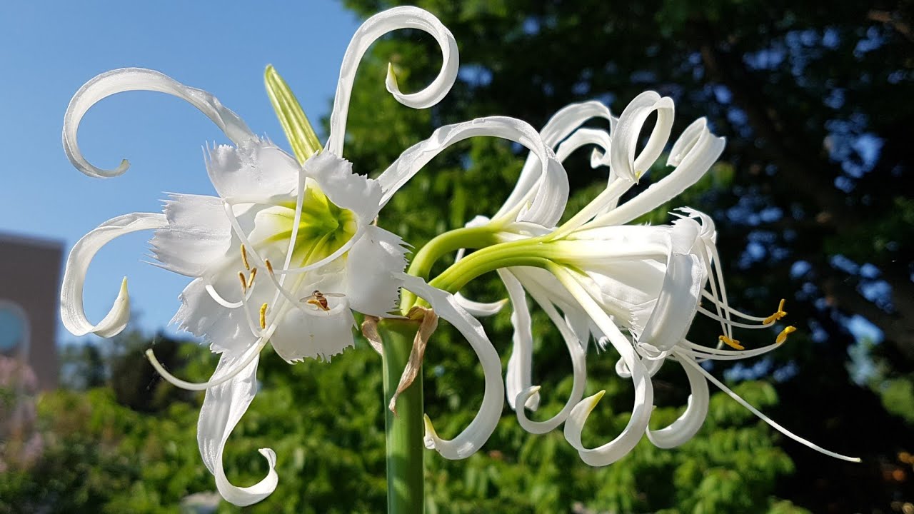 Цветята на културата приличат на лилия или звезда, но на някои приличат на паяк. Пъпките са разположени на дълга куха тръба, отворена в тесни чашелистчета. Цветът е бял със зелена основа, диаметър 12-17 см. В чадъчните съцветия се образуват 6-8 цветя с приятен аромат.