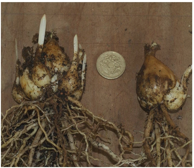 - Чрез разделяне на крушката. Понякога се случва културата да не отглежда дъщерни луковици или да е стара. Тогава методът за разделяне на луковицата е подходящ за размножаване. За целта се нарязва на 2 или 4 части с остър стерилен нож. На всяка част трябва да остане парче от дъното и шията. Резените се поръсват с пепел, канела или натрошени въглища и се оставят да изсъхнат за 3 часа. След това за около две седмици те покълват в мокър пясък или дървени стърготини, докато се образуват корени. Това е последвано от трансплантация и стандартни грижи.