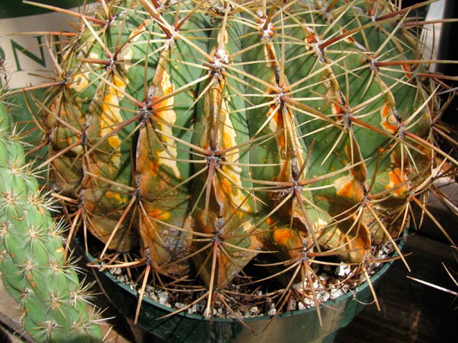 Често на кактусите се появява петниста ръжда, която засяга стъблото под формата на ръждясали кори или ивици. Причината за това заболяване може да бъде слънчево изгаряне или проникване на студена вода върху стъблото, както и рязко намаляване на температурата на въздуха в помещението. Ако такива петна вече са се появили, е доста трудно да ги премахнете, тъй като те започват да се разпространяват в други части на стъблото и стават все по-обширни.