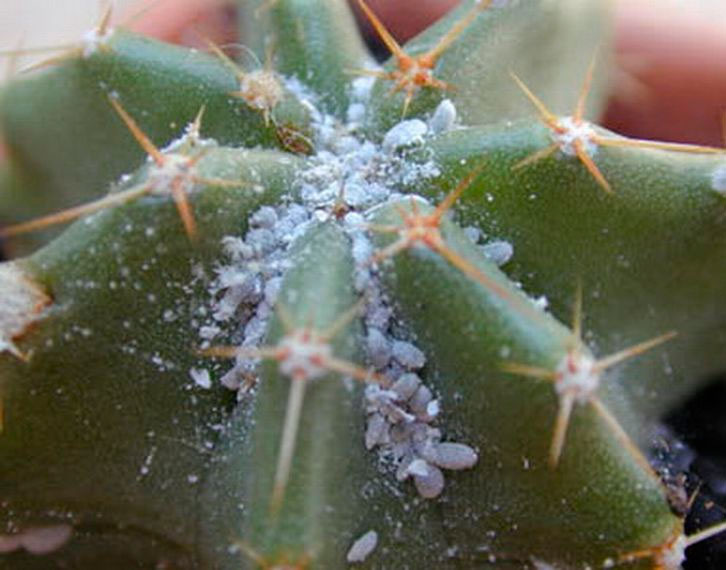 Ако на кактуса се виждат бял цвят или точки, които приличат на пух, това е сигурен знак, че брашнестата буба е нападнала растението. Причината за появата на този вредител се счита за неправилна грижа, инфекция от друго растение или проникване през замърсена почва.