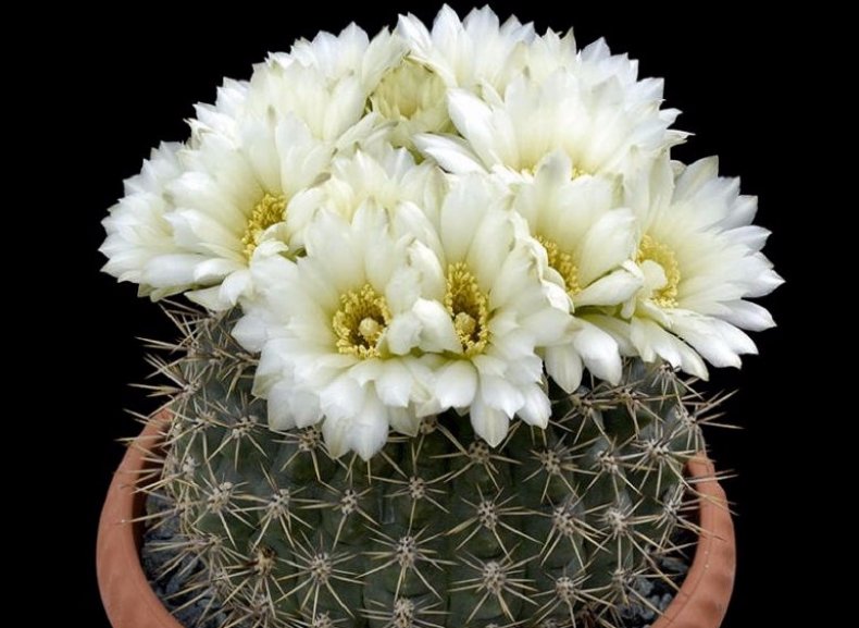 | Horst Gymnocalycium | Понякога на сферично стъбло с диаметър 10 см могат да се появят малки издънки. Самият кактус е разделен на 5 плоски ребра. Всеки сегмент има 3-4 кръгли ареоли, съдържащи 5 странични бодли, издигнати над тялото на растението. Младите ареоли растат дълги (до 11 см) бледорозови или бели цветя, обрамчени от едни и същи люспи. |
