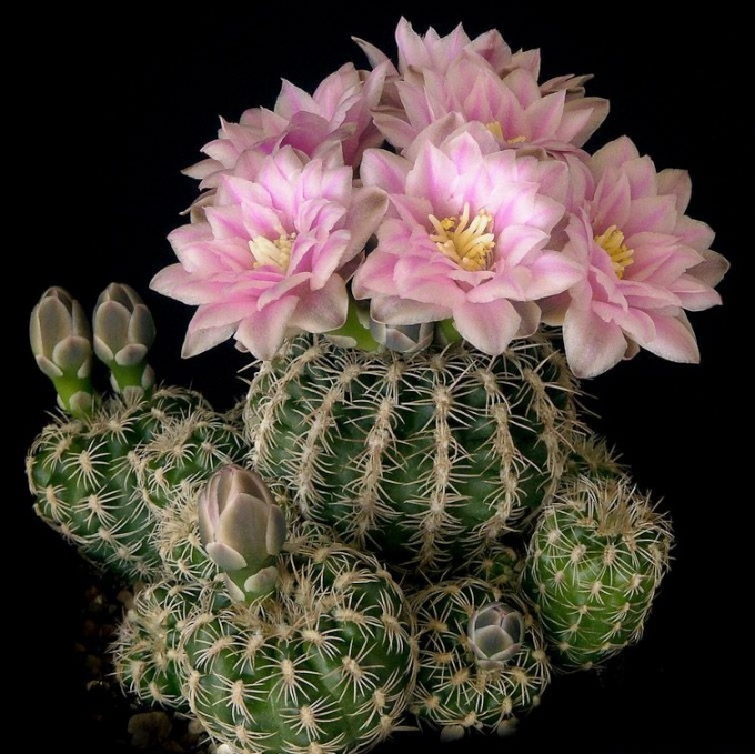 | Гимнокалиций Миханович | В mihanovichii гимнокалициум зеленикаво-сивото стъбло е значително сплескано, поради което растението едва достига височина от 5 cm. Особената форма на ребрата е характерна за вида (има 8-10 от тях): · Ръбът е вълнообразен, заострен; · В разрез са триъгълници; · По краищата има ред ареоли, от които се отклоняват заострени напречни издатини. Всяка ареола съдържа 5 сиви бодли, огънати към стъблото. Между бодлите в горната част на топката растението изхвърля красиви розово-зелени цветя. Има и разновидности с други нюанси: бяло, чисто розово и жълто. |