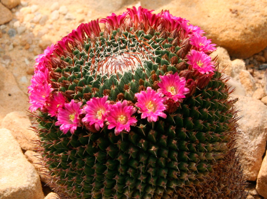 - Мамилария. Тези малки кактуси са оформени като топка. Тяхната отличителна черта са розетките от дълги бодли, които се отварят като цвете. Някои сортове дори се оказват напълно заплетени в тях. Цъфтящият кактус mamillaria изглежда много интересен: той произвежда не едно цвете, а няколко, всички те са разположени в кръг в горната част на стъблото.